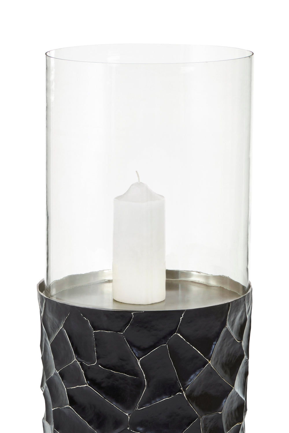 This large floor-standing hurricane candle holder features a cylindrical glass insert that emits a soft, warm glow. Its sturdy metal base, with a hammered texture, enhances stability and creates a shimmering effect when the candle is lit.