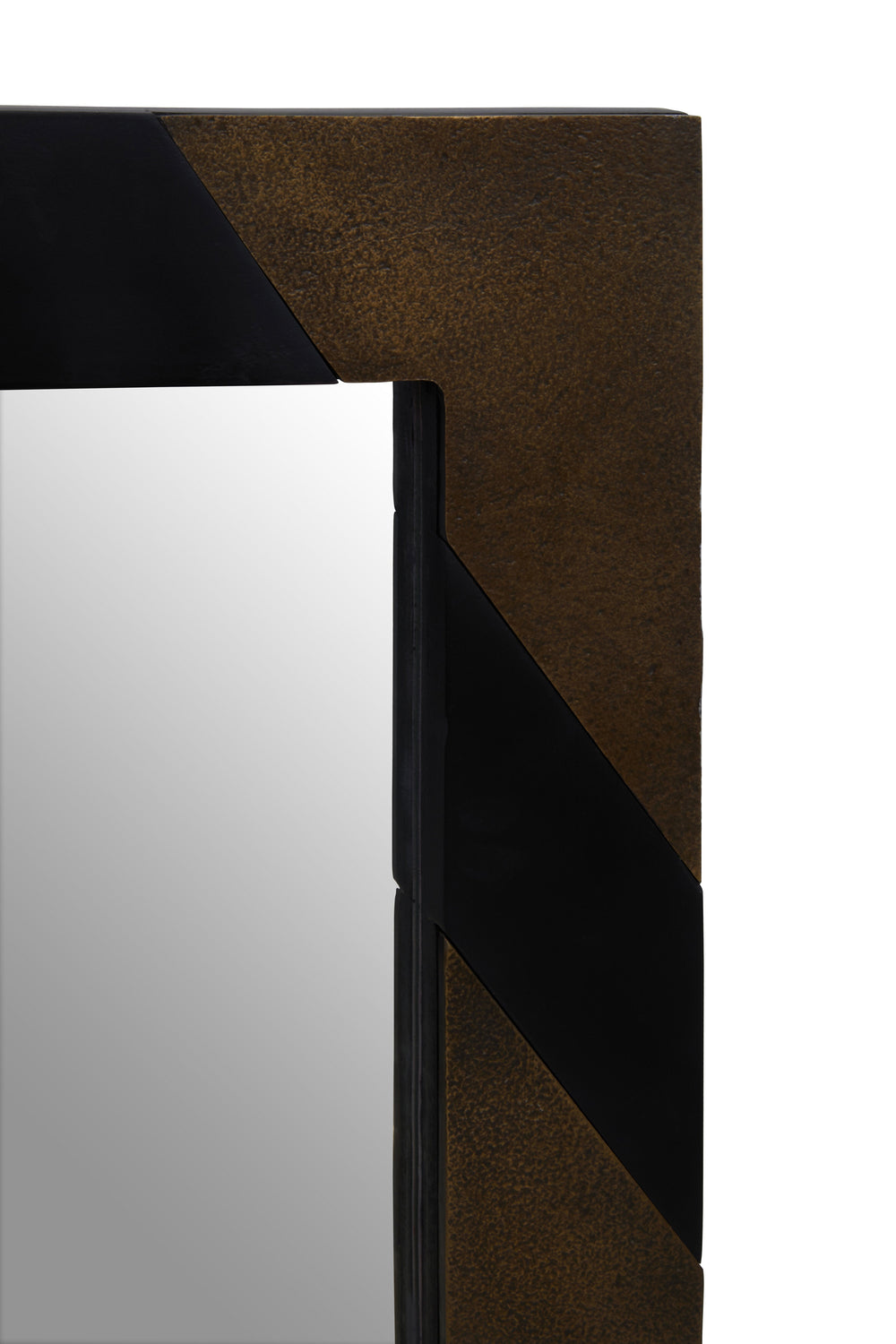 This wall mirror features a frame crafted from acacia wood, finished in metallic black and gold. Its bold, thick stripes along the border create a striking contrast, making it a perfect addition to any space.