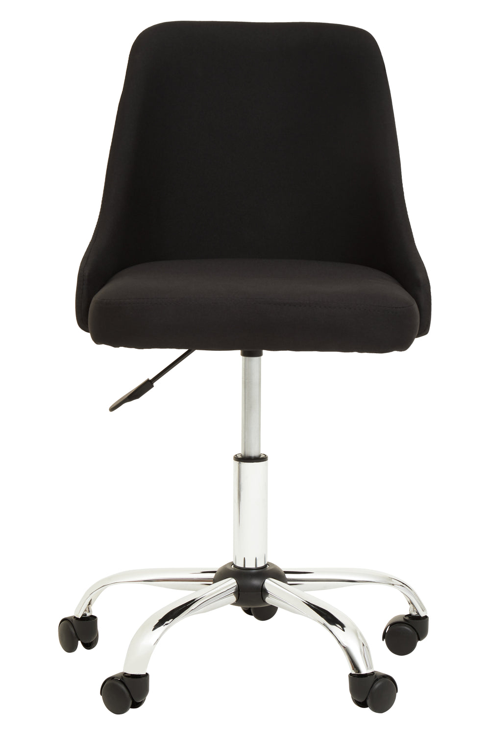 Designed for comfort and functionality, this home office chair features sleek black upholstery for a modern touch. The sturdy chrome metal base with smooth-rolling wheels ensures effortless mobility. With its swivel function, height adjustability, and armless design, it conveniently tucks under the desk to save space.