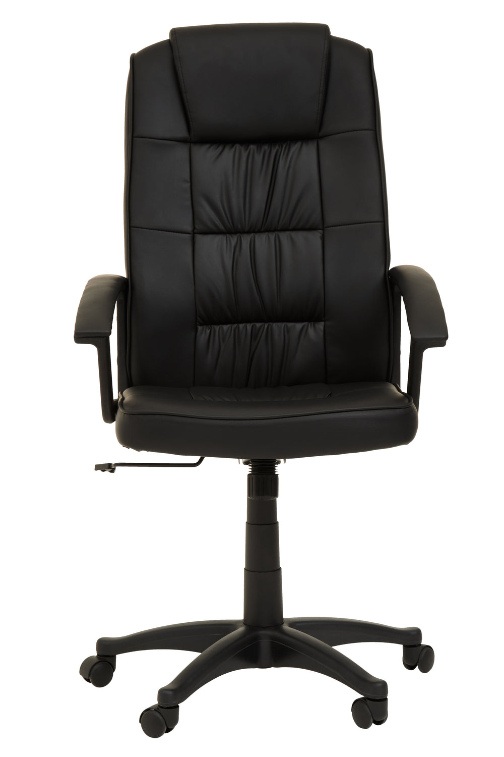 This executive home office chair showcases a timeless design with black leather-effect upholstery for a sophisticated look. The high back and integrated armrests provide excellent support, promoting a comfortable posture during long hours of work. A sturdy black base with smooth-rolling wheels ensures effortless mobility in any direction.