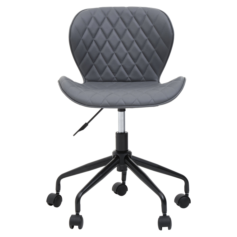 This contemporary home office chair features a stylish scooped seat with elegant crisscross stitching on dark grey faux leather. Its armless design allows it to tuck neatly under the desk, making it a space-saving solution. The sturdy black base offers reliable support and smooth-rolling wheels for effortless 360-degree movement.
