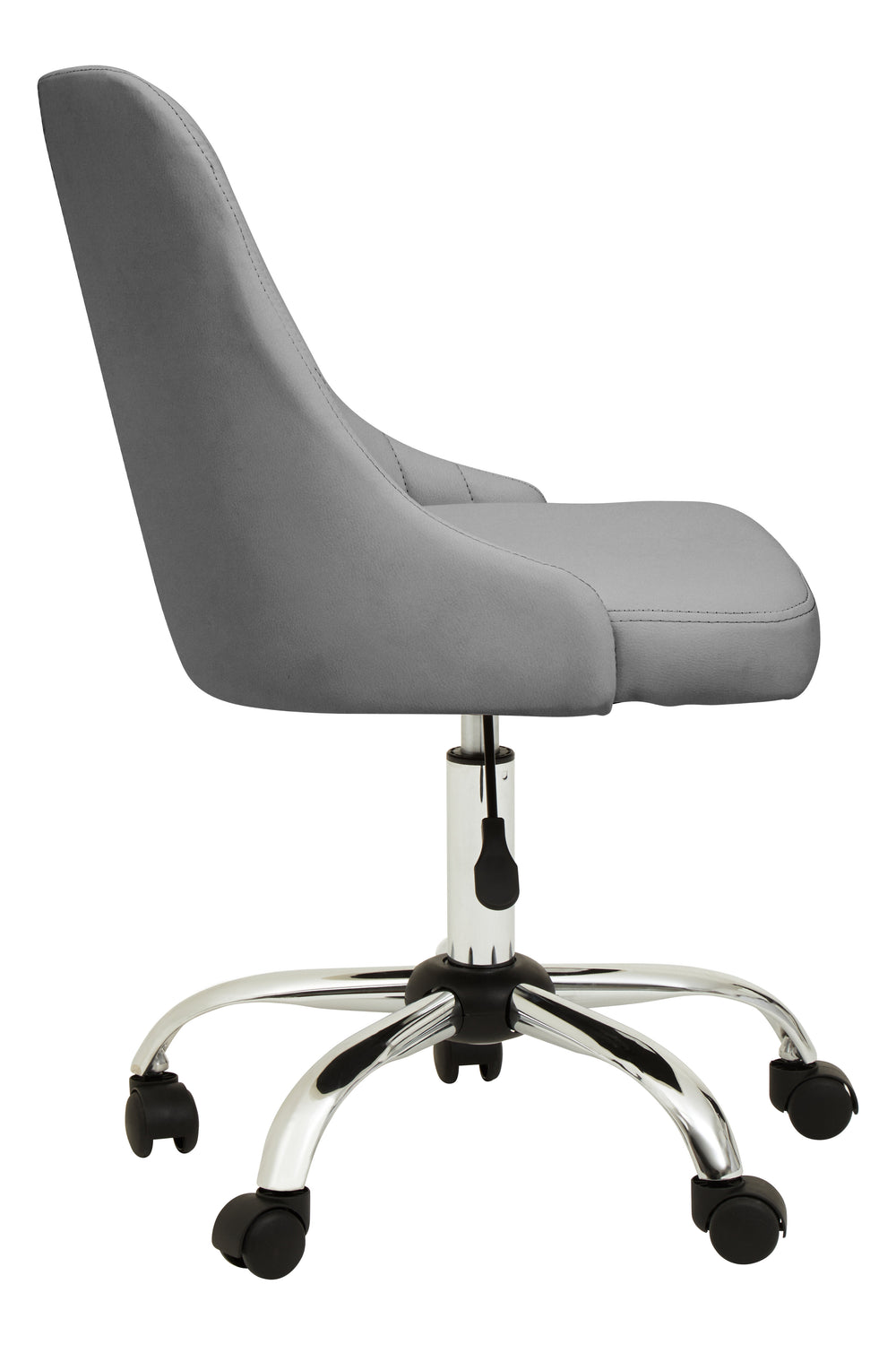 Designed for both comfort and practicality, this home office chair features sleek leather-effect upholstery with elegant channel tufting for a refined look. The sturdy chrome base with smooth-rolling wheels ensures effortless mobility. Its armless design allows it to be neatly tucked under the desk, making it a perfect space-saving solution.