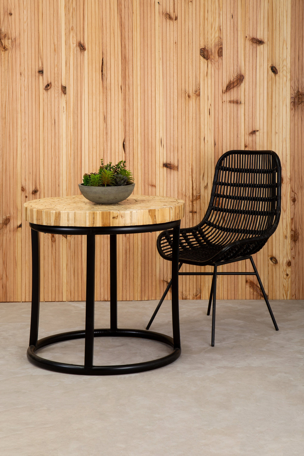 This table showcases intricately interlinked teakwood branch pieces, forming a beautifully textured round top. The natural finish contrasts elegantly with the matte black iron frame, creating a striking balance of organic charm and modern sophistication—perfect for any living space.