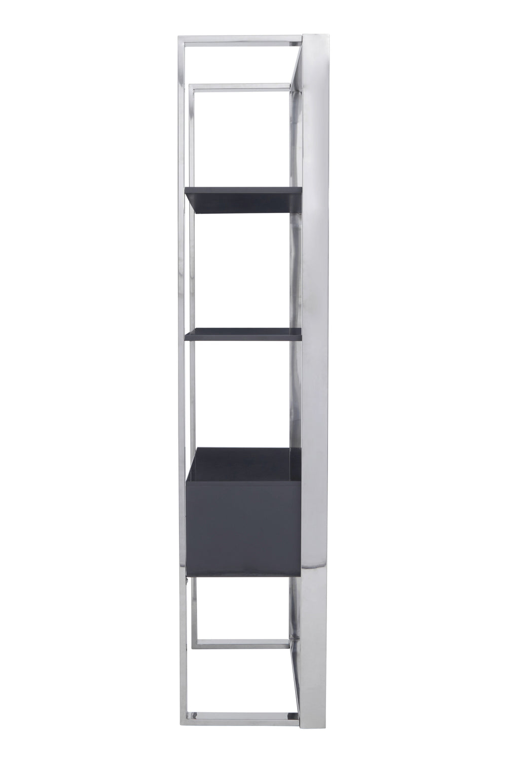 Elegant and sophisticated, this shelf unit showcases a polished stainless steel frame with three spacious shelves. A grey storage drawer with a decorative fluted pattern adds both functionality and a striking monochrome contrast to the sleek design.