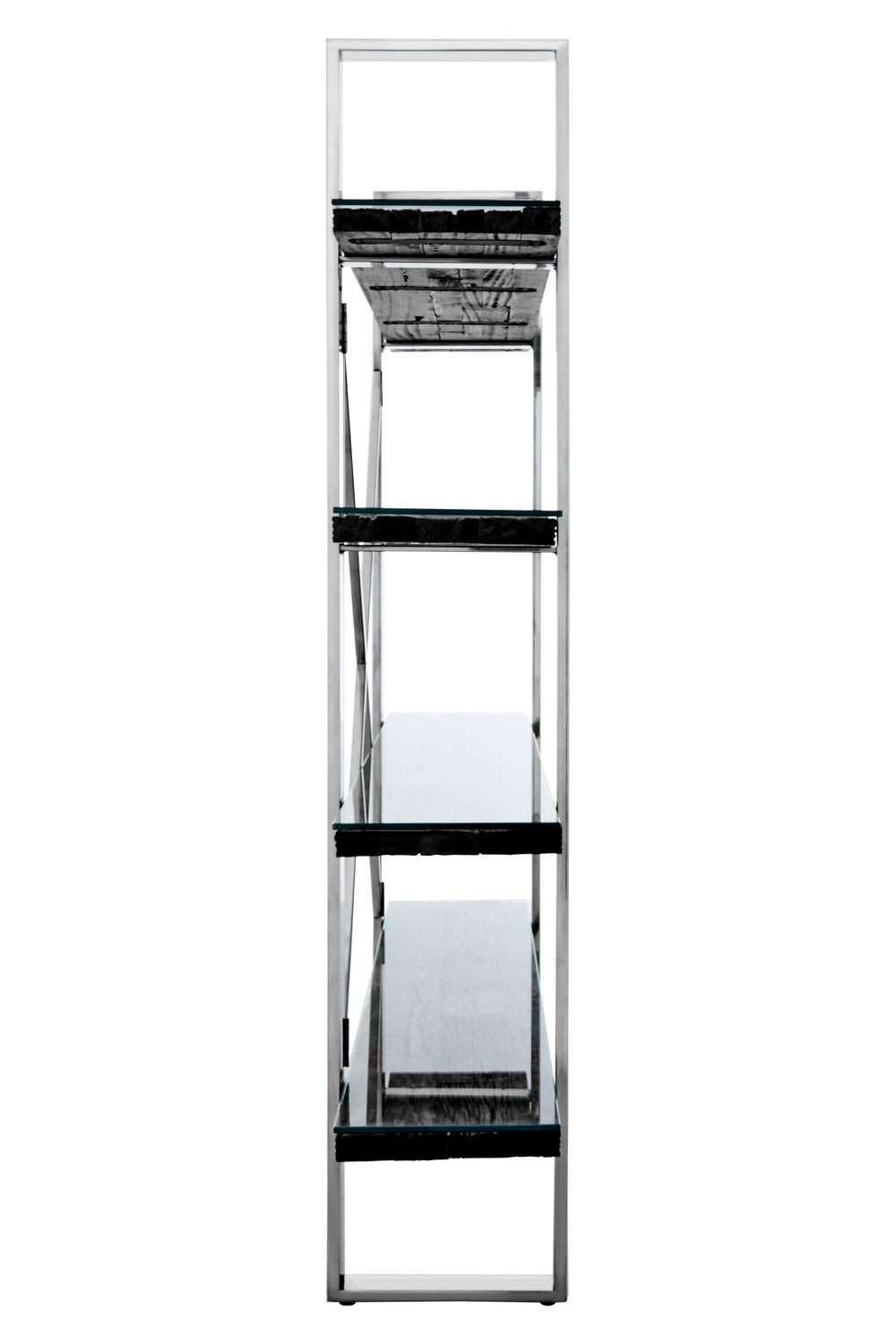 This four-tier shelf unit enhances any space with its black wooden shelves and sleek silver frame. The open glass-topped design allows for easy access and effortless cleaning, while its modern structure adds a sophisticated touch to any room.