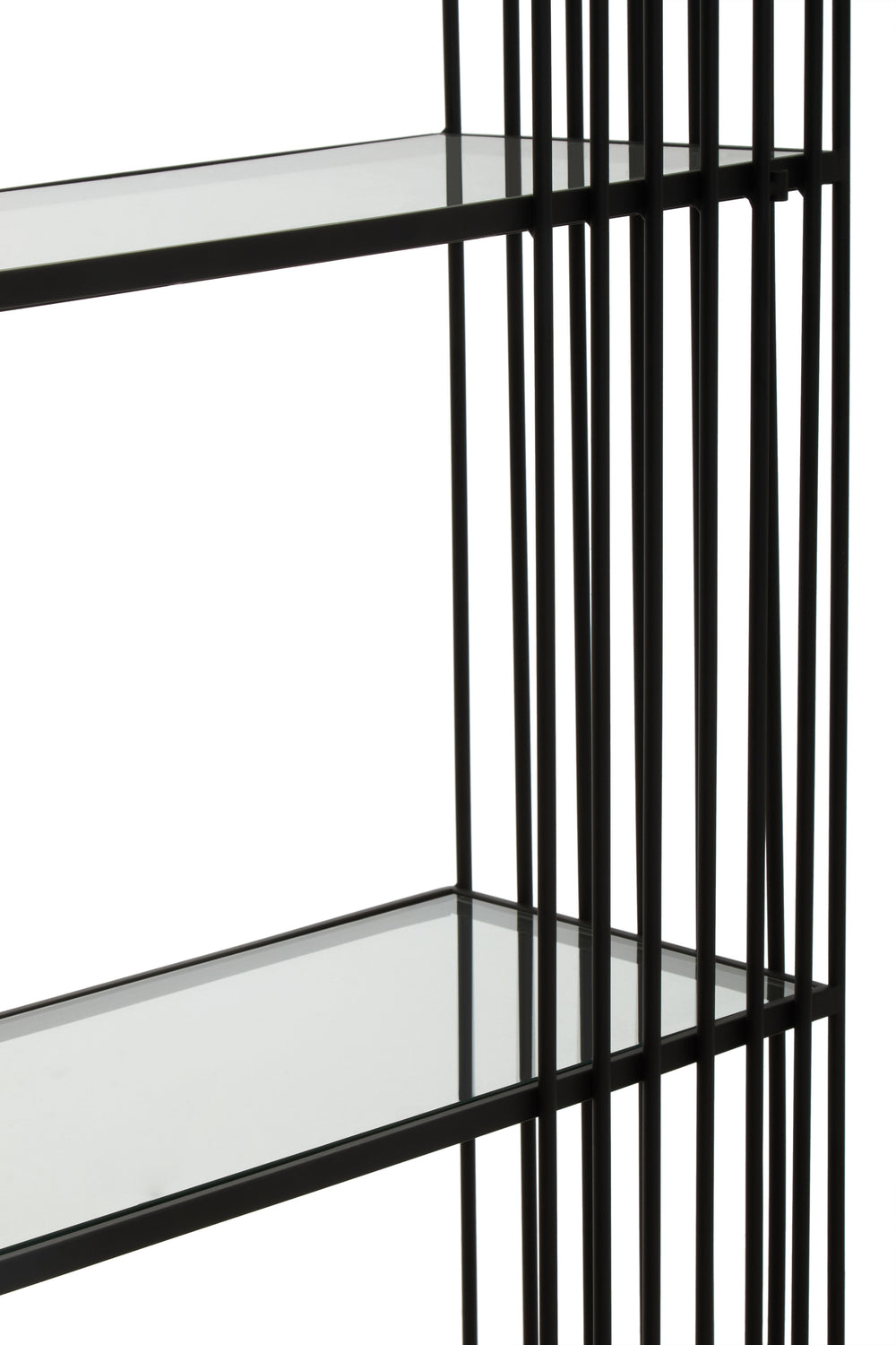 This bookshelf features a sleek black iron frame with vertical rods on both the front and back, adding a touch of sophistication. Its clear glass shelves enhance the elegant design, while the sturdy iron construction ensures durability and stability.