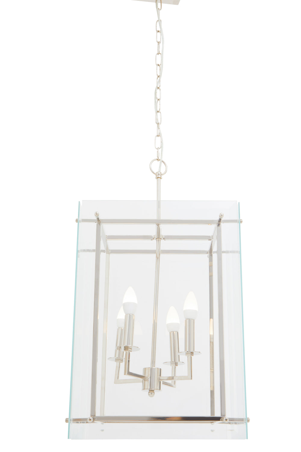 Boasting a slim, box-shaped fixture, this four-bulb pendant light creates visual intrigue. The nickel finish metal frame in a rectangular shape is encased in a clear glass shade, enhancing its industrial aesthetic while casting a warm, cosy ambience.