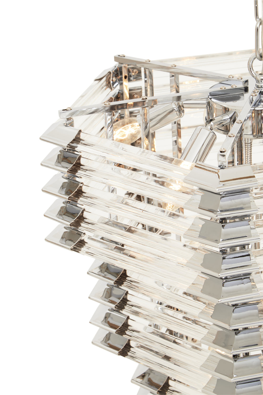 This chandelier showcases clear glass prisms on a large frame, enhanced by a transitional finish for a decorative appeal. With twelve bulbs, it casts multidirectional light, while the glass and chrome finish is accented by dazzling crystal drops for a touch of elegance.