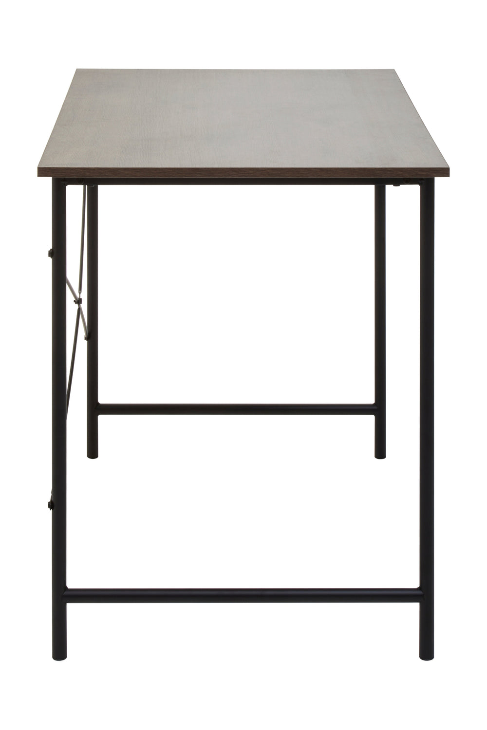 The rectangular natural oak effect wooden top sits neatly upon a black metal frame, offering a minimal and subtly industrial design. The cross-pattern structure adds both stability and visual interest to the desk.