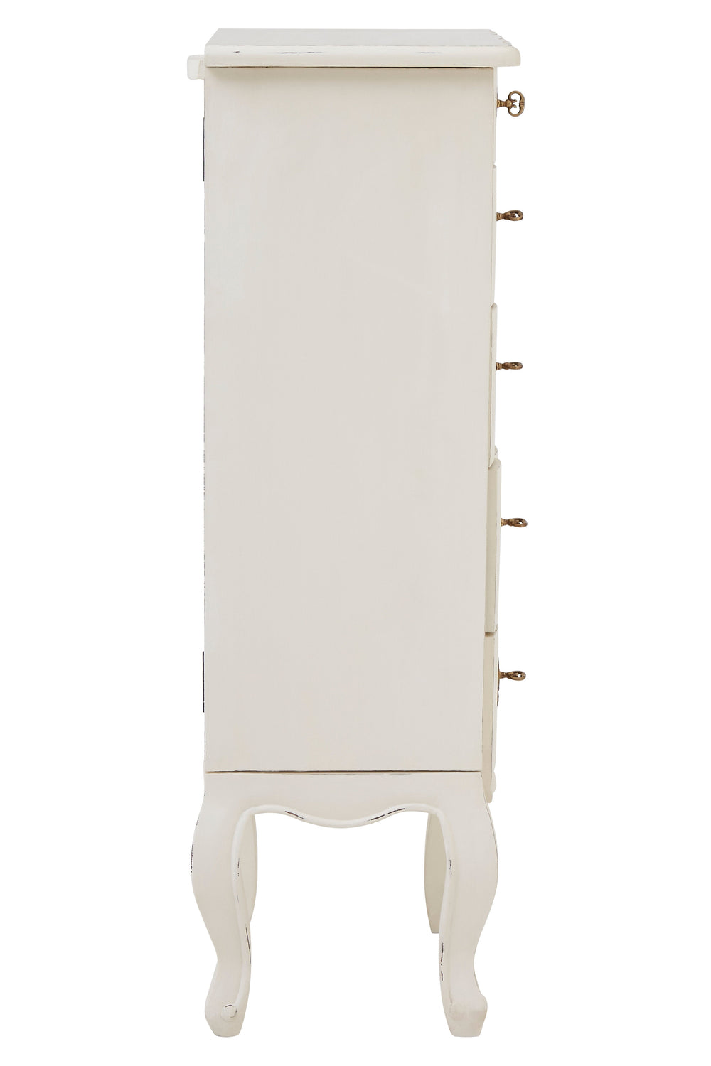 These handles perfectly complement the chests intricate carved details, from its gracefully curving feet to the undulating base. Crafted from natural bayur wood with a subtly coarse texture, it offers a tactile finish. The distressed white color enhances its antique-inspired charm, adding character and elegance to any space.