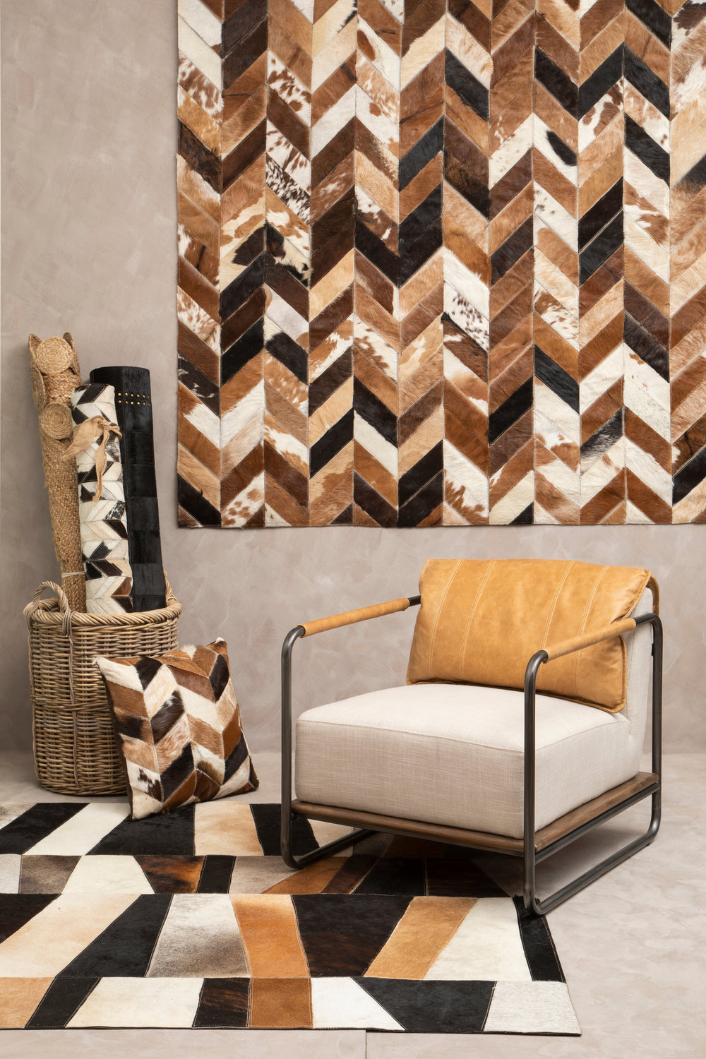 This large rug, made from genuine cowhide leather, showcases multicoloured patchwork in square cutouts. The warm metallic stud trim enhances its understated design with a touch of luxury.