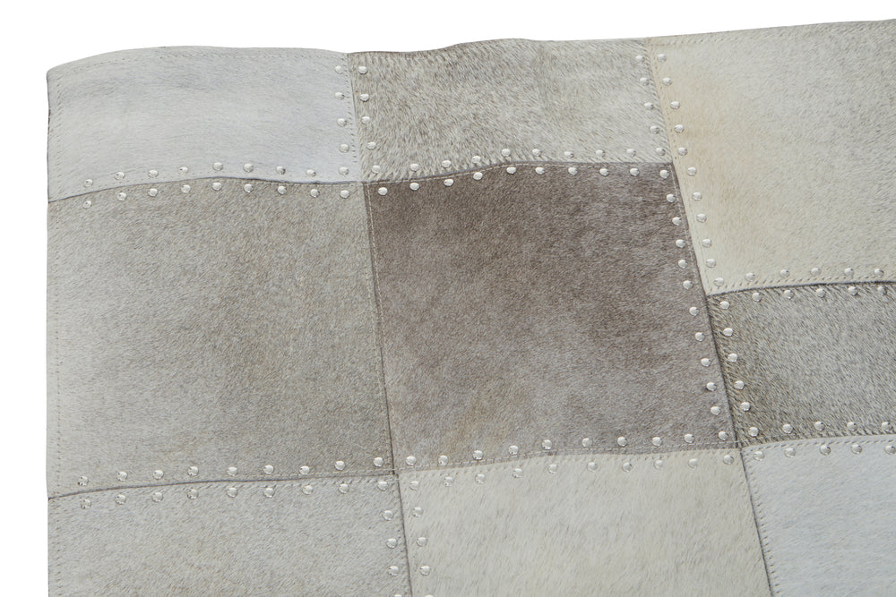 Crafted from genuine cowhide leather, this rectangular rug showcases patchwork art in subtle shades of grey. Each cutout section is accented with a minimal metallic silver stud trim, adding a touch of luxury to its design.