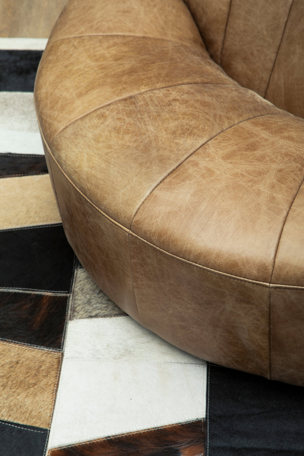 Crafted from genuine cowhide leather, this small rug features striped patchwork arranged in a sequence to form an abstract work of art. With an array of hand-stitched geometric cutouts, it serves as an eye-catching centerpiece.