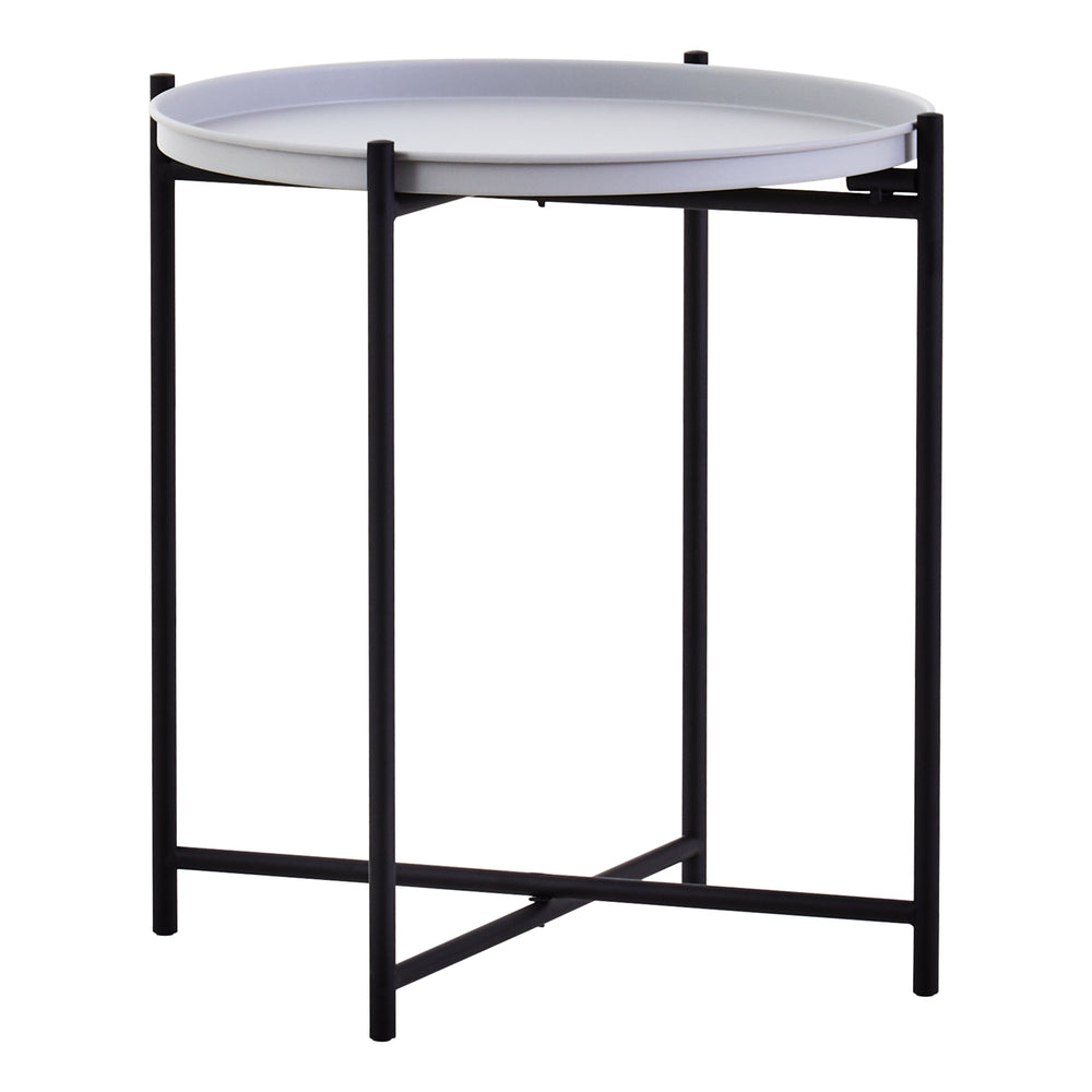 This side table embodies modern minimalism with a grey iron top featuring raised edges for a refined look. The rounded top is supported by sleek black metal legs, connected at the base with a stylish cross detail, adding both stability and visual appeal.