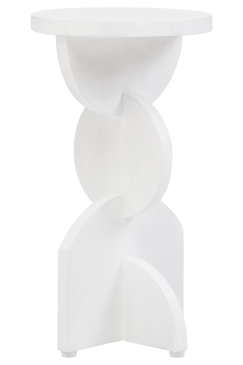 Crafted from mango wood, this side table features a round top supported by a sculpted base with a striking geometric aesthetic. The whitewash finish highlights the natural grain and texture, adding warmth and character to any modern space.