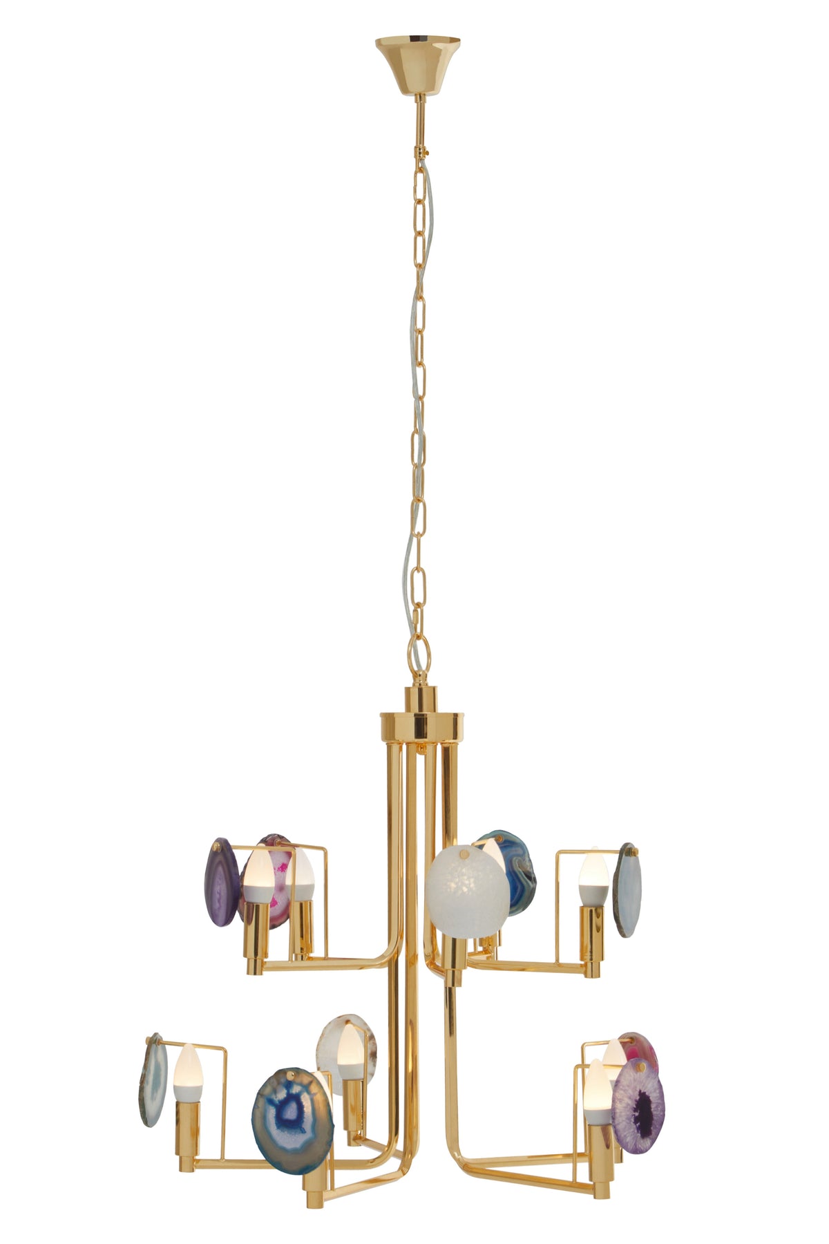 With a sleek and slim profile, this pendant light exudes illumination in the living area. The angular metal frame with a luxe gold effect finish features several agate discs positioned in front of ten bulbs, creating an elemental and sophisticated appeal.