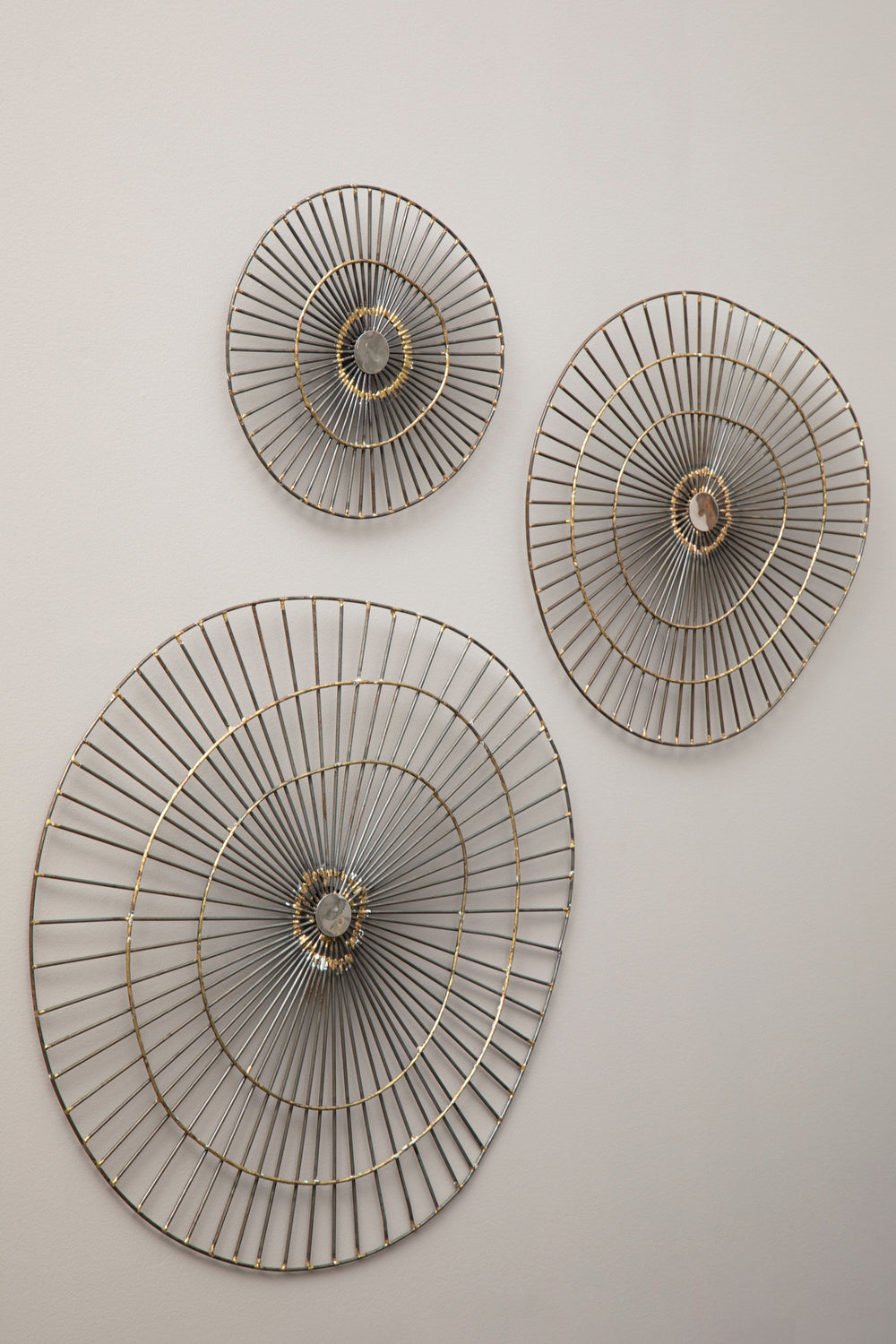 Sleek iron wires radiate from a circular center, forming a striking sunburst design in this large wall art. The warm metallic accents blend seamlessly with the muted wireframe hues, while the flowing edges make a bold statement.