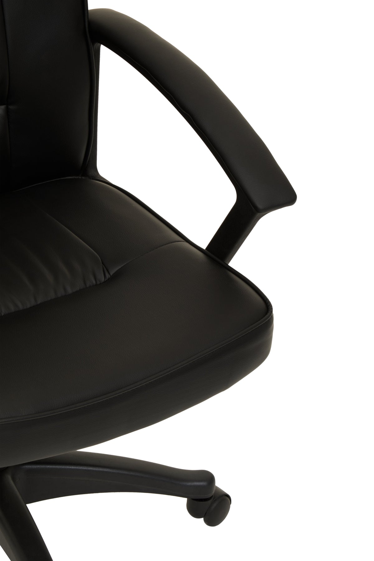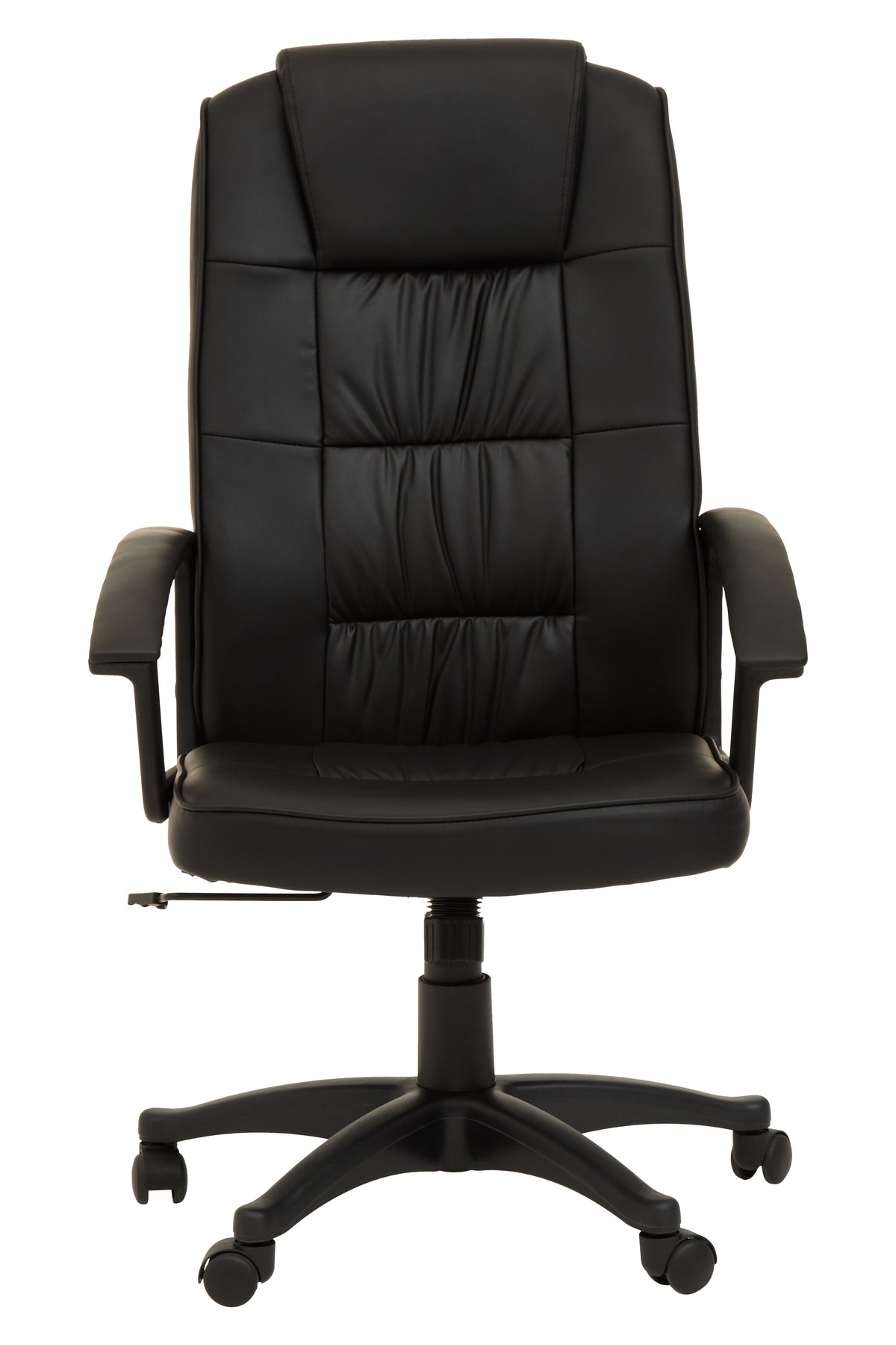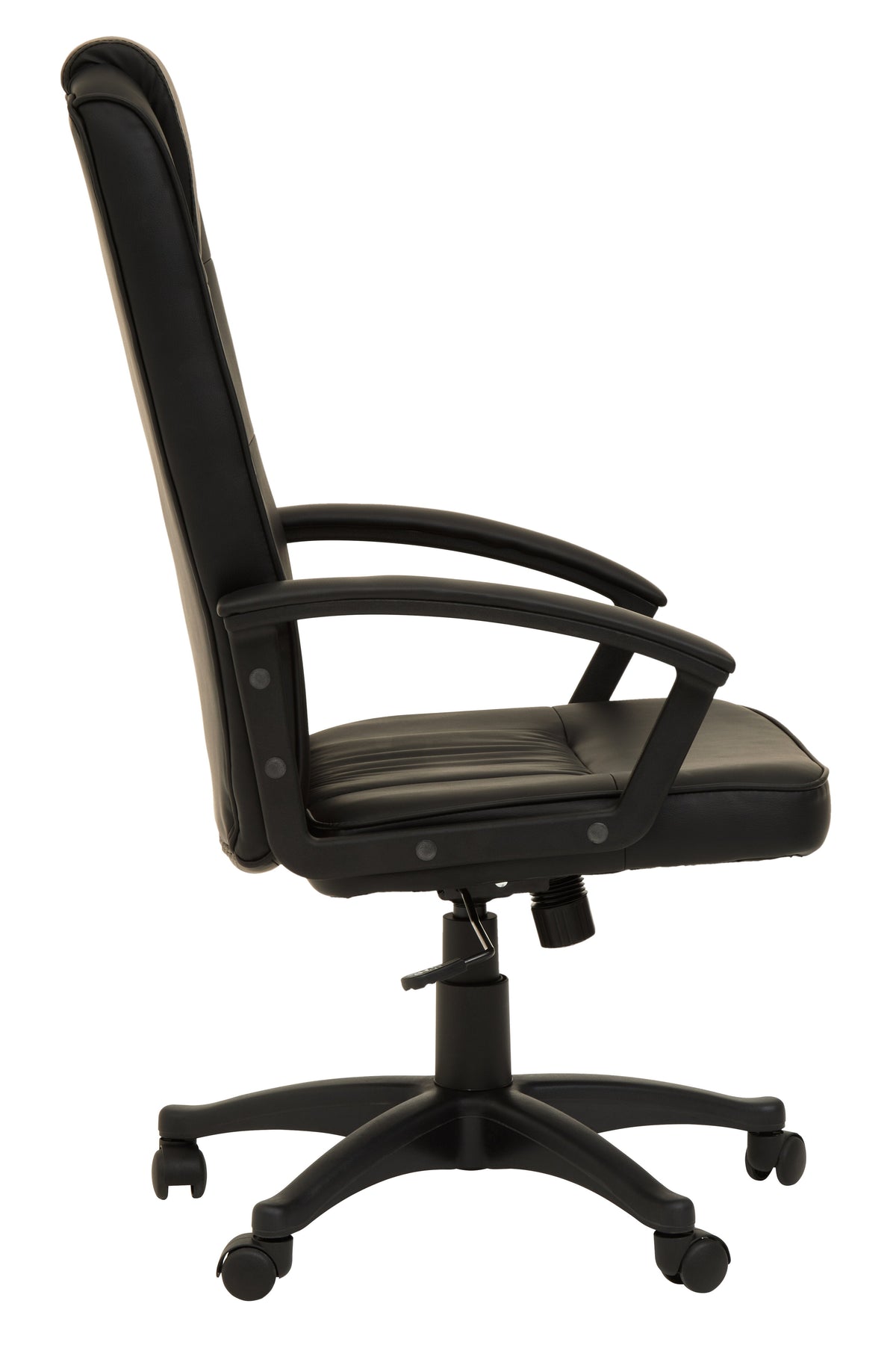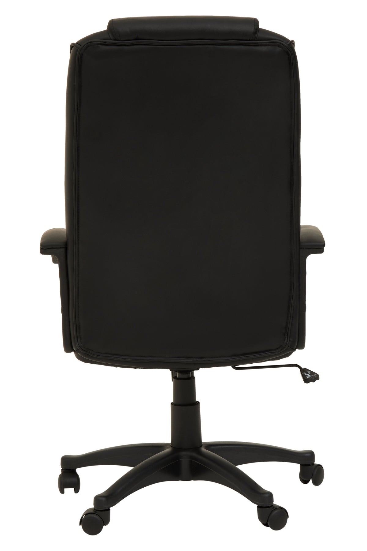 This executive home office chair showcases a timeless design with black leather-effect upholstery for a sophisticated look. The high back and integrated armrests provide excellent support, promoting a comfortable posture during long hours of work. A sturdy black base with smooth-rolling wheels ensures effortless mobility in any direction.