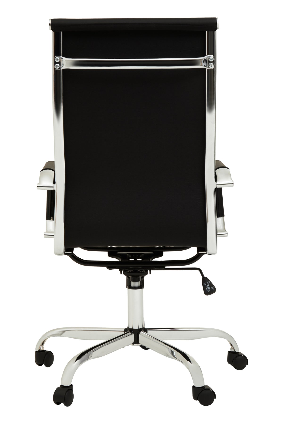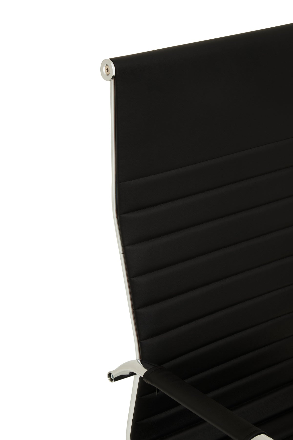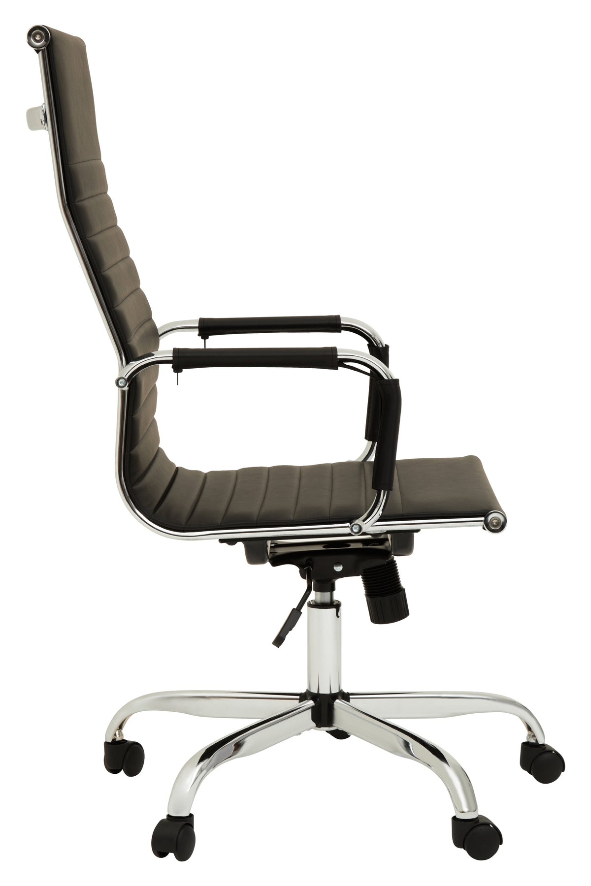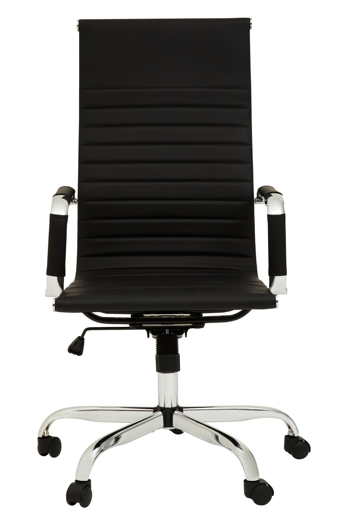 This versatile executive home office chair features a sleek one-piece molded seat upholstered in premium faux leather. Its clean, modern design with subtle horizontal lines exudes professionalism and style. Supported by a sturdy chrome base with smooth-rolling wheels, it ensures both stability and effortless mobility.