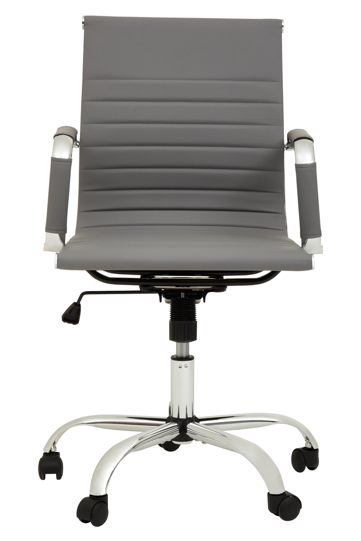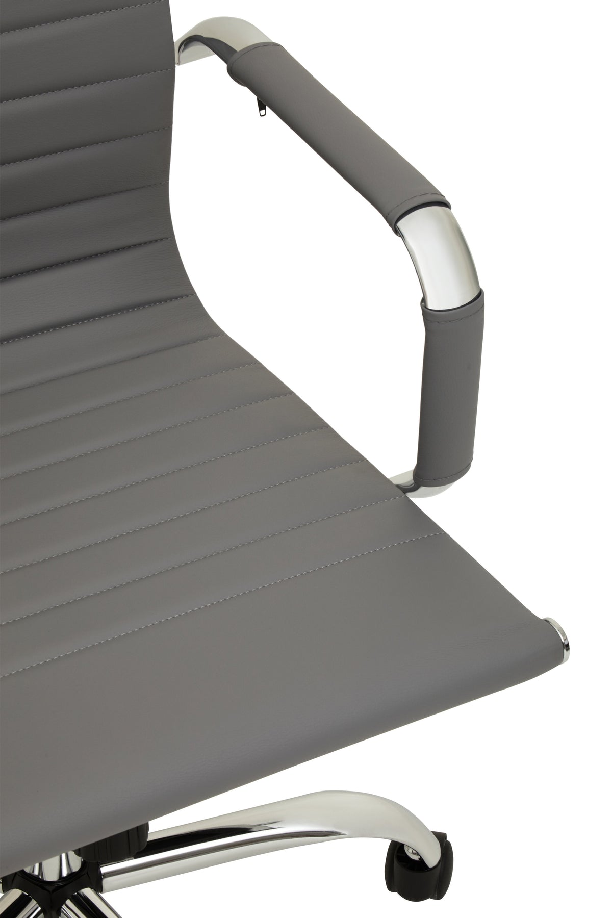 The grey one-piece molded seat is the epitome of modern home office design. With a sleek low back and integrated armrests for added comfort, it offers both style and support. The sturdy chrome base with smooth-rolling wheels ensures effortless mobility and stability, making it a practical choice for any workspace.