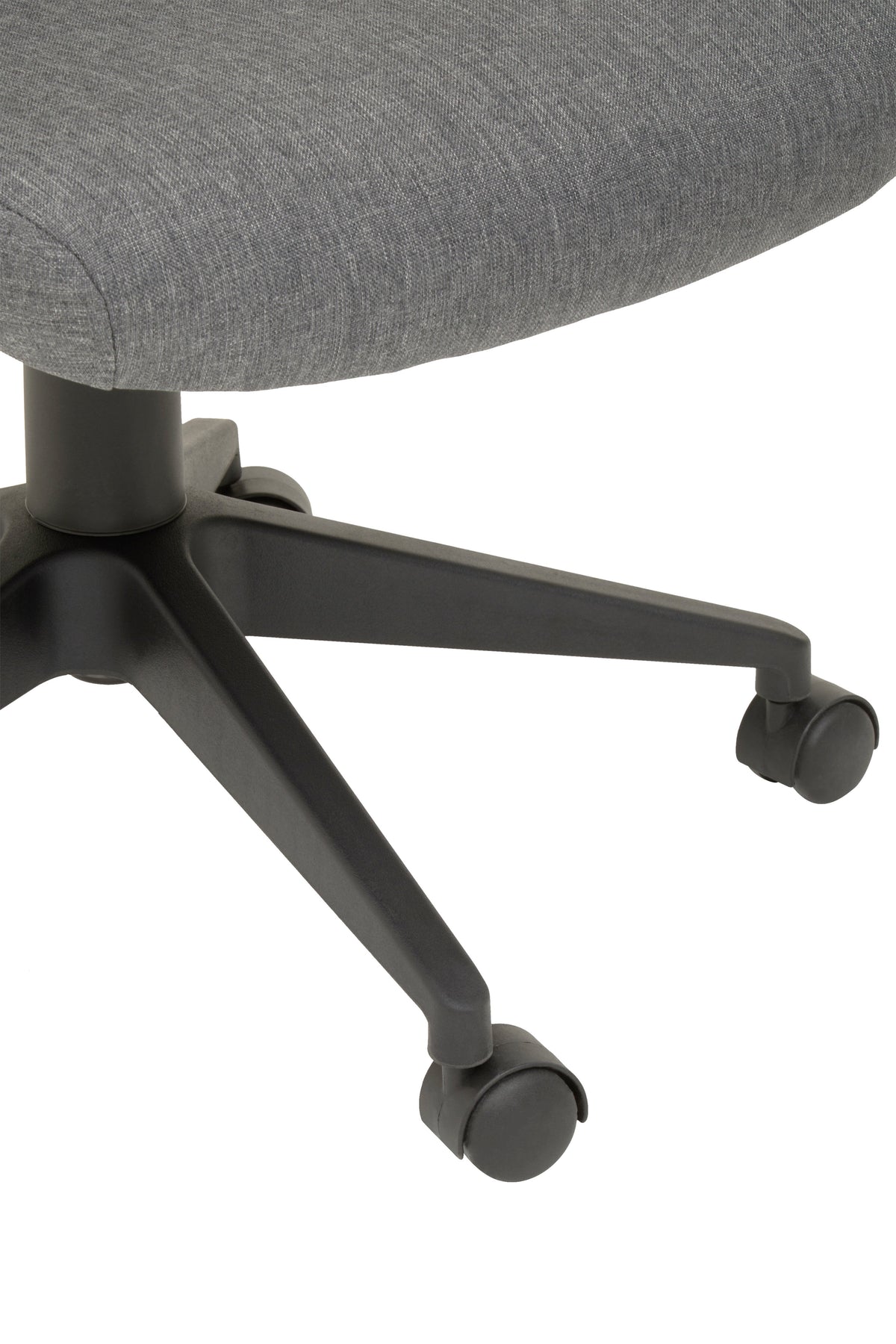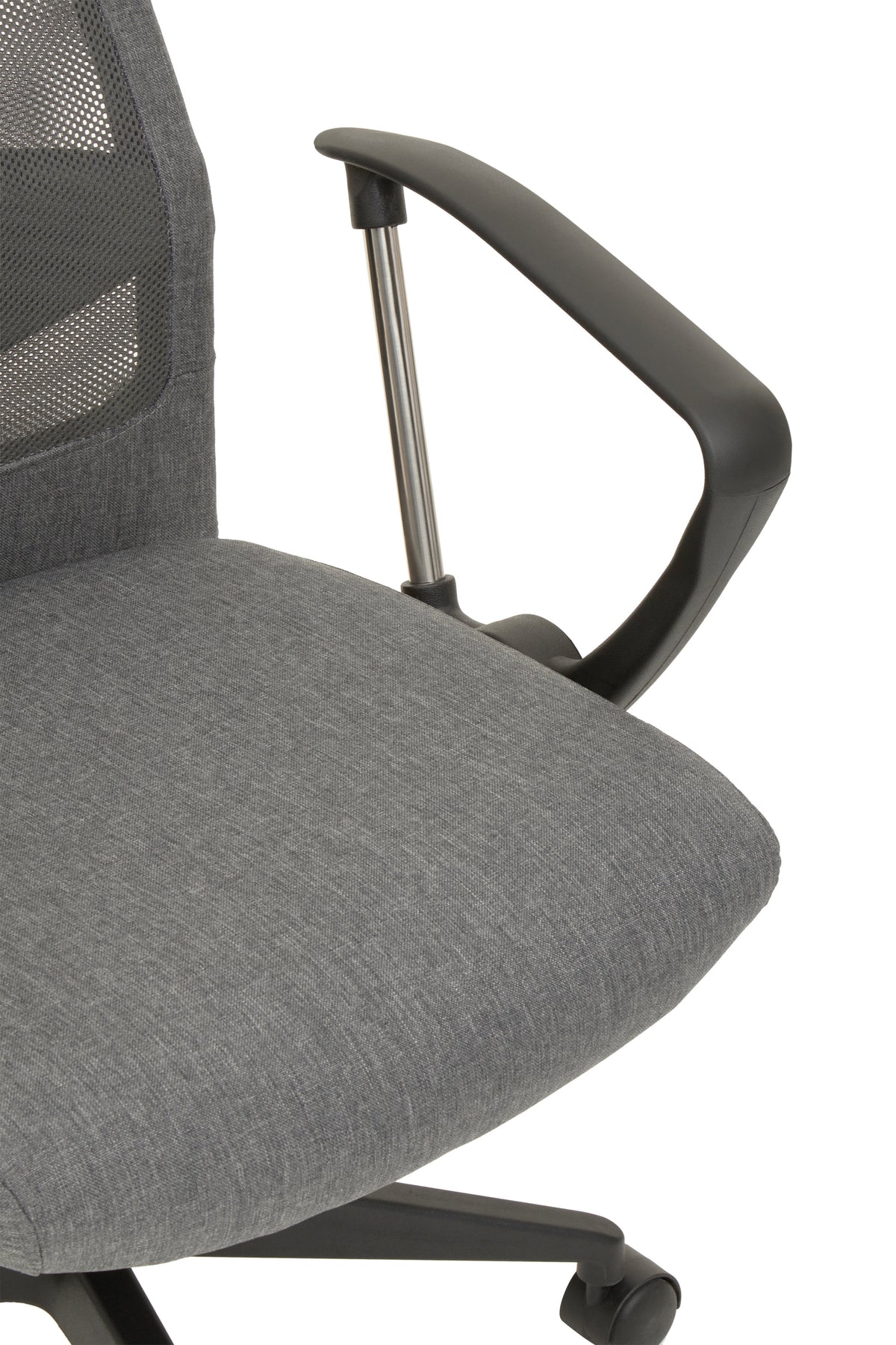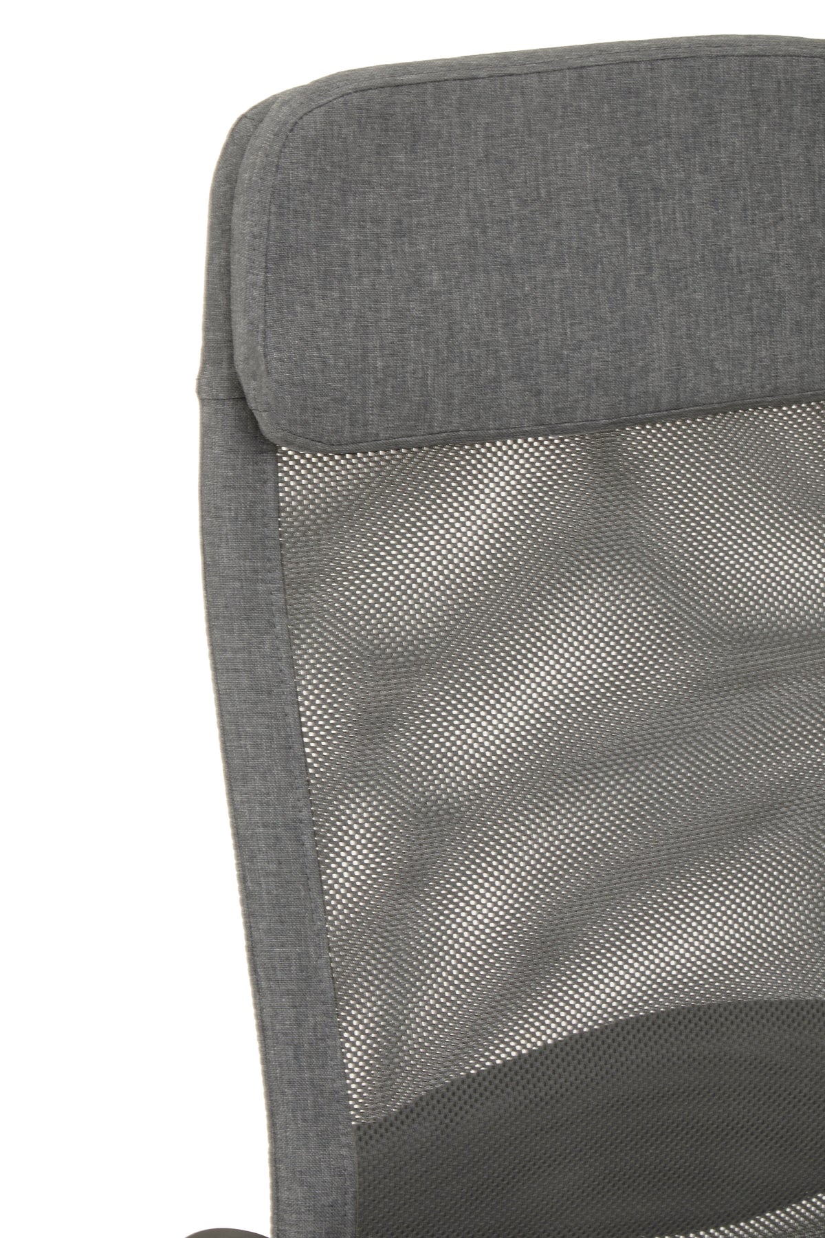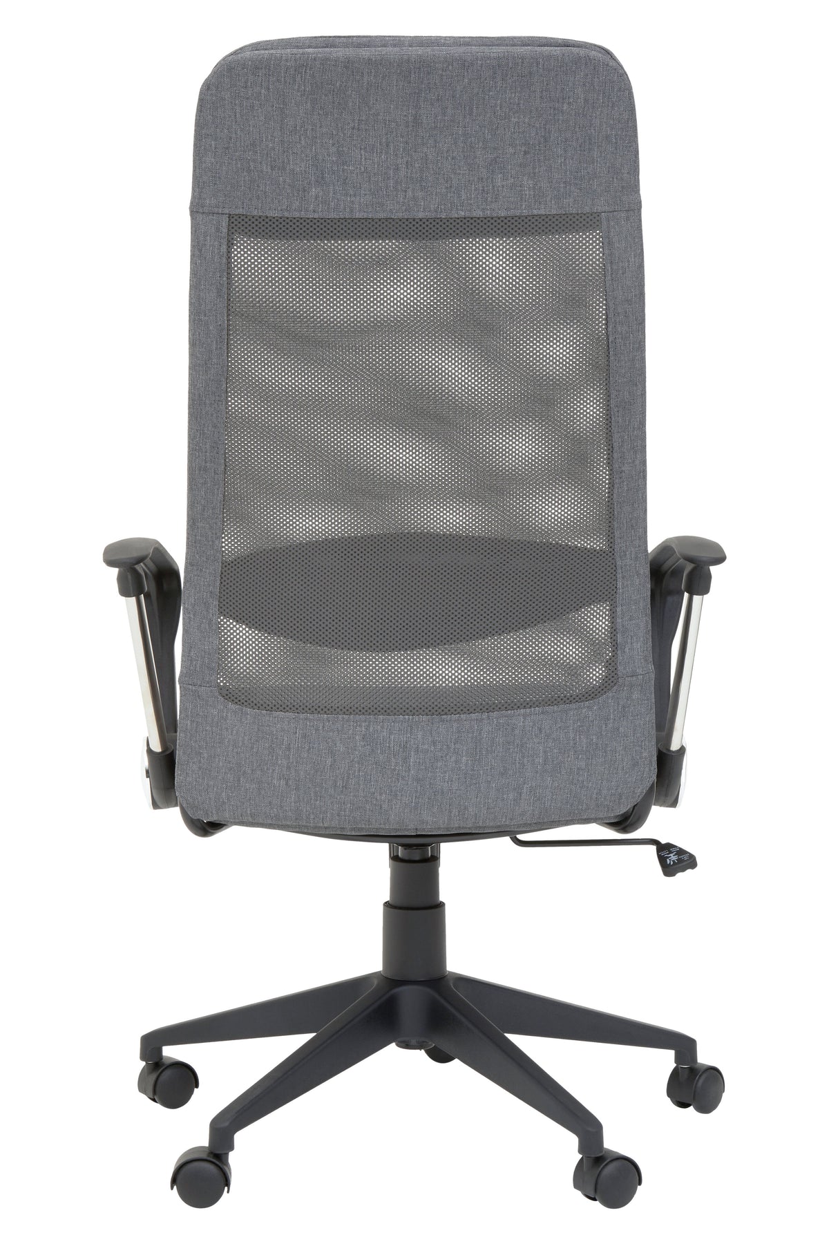 The high-back home office chair is ergonomically designed for superior comfort and support. Upholstered in stylish grey fabric with breathable grey mesh, it ensures airflow for a cooler seating experience. A sturdy black base provides stability, while the padded headrest, adjustable armrests, and built-in lumbar support promote better posture throughout the day.