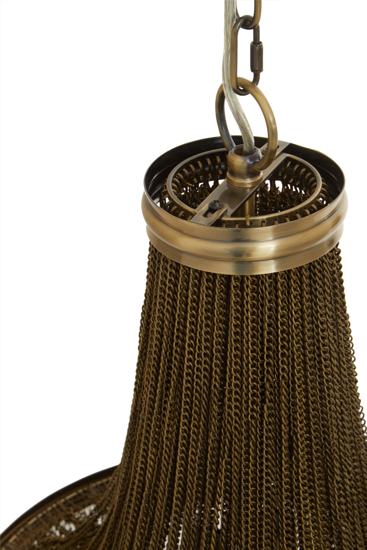 The Chain chandelier brings timeless elegance and a sophisticated ambience to the dining room. Featuring six bulbs within the frame, this piece emits a warm glow through its gathered veils of metal chains in an antique brass finish, making it a striking focal point in any living space.